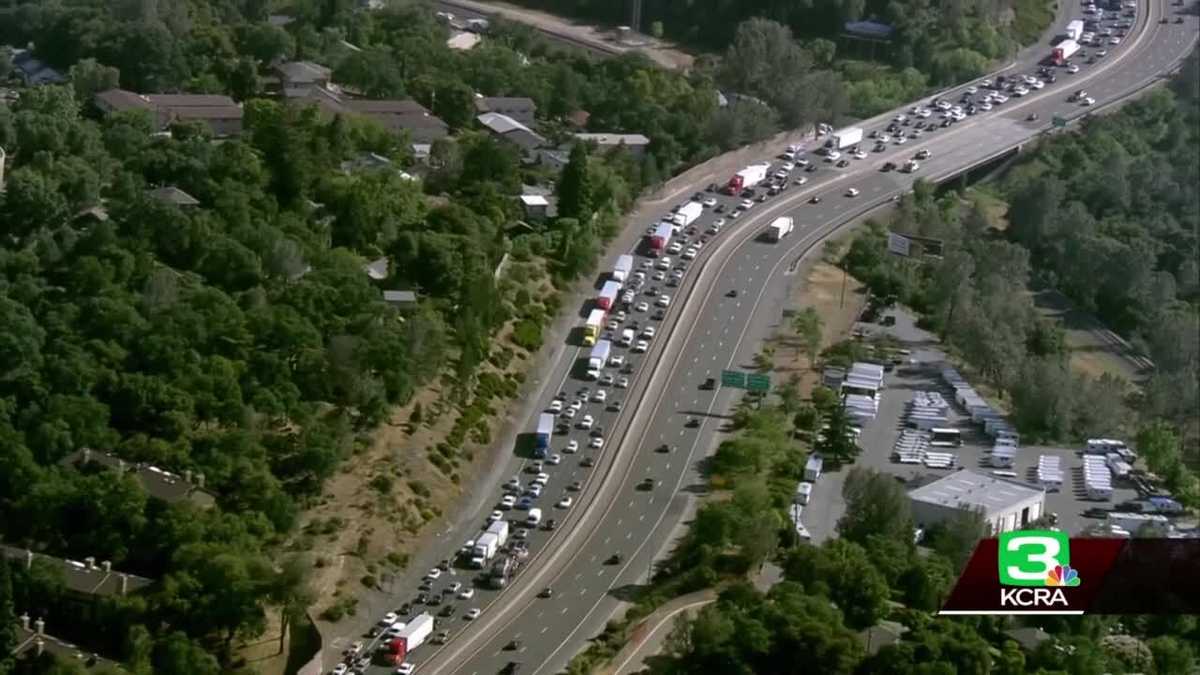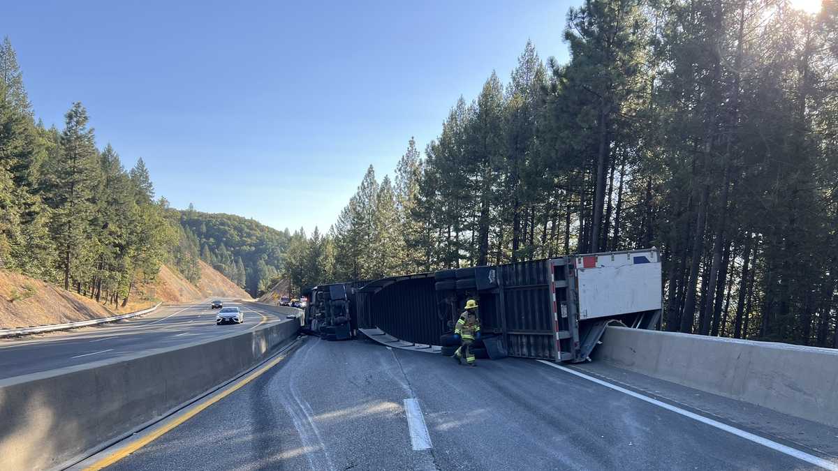 Overturned big rig blocks I 80 in Placer County causing traffic backup