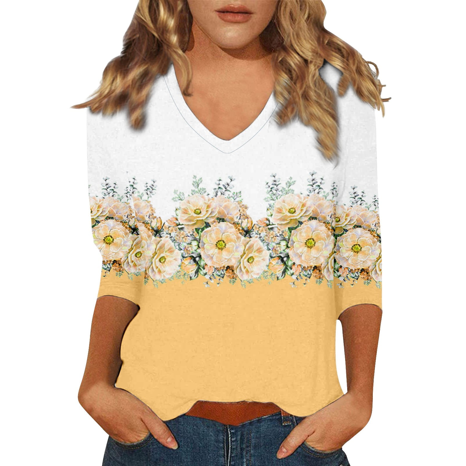 AJHSAKLt Ladies Tops And Blouses Womens 3/4 Sleeve Print Plain Travel