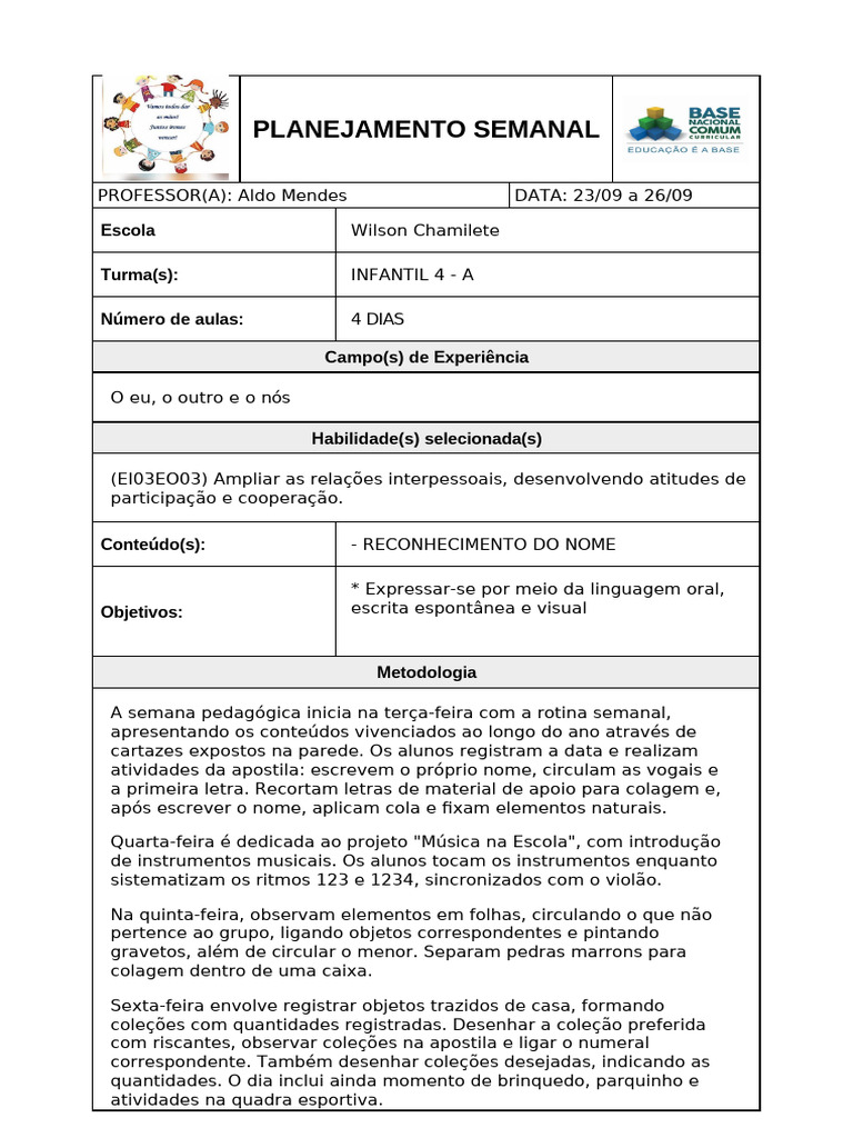 Plano de aula número 3 Educação Infantil Pré escola Planejamento de