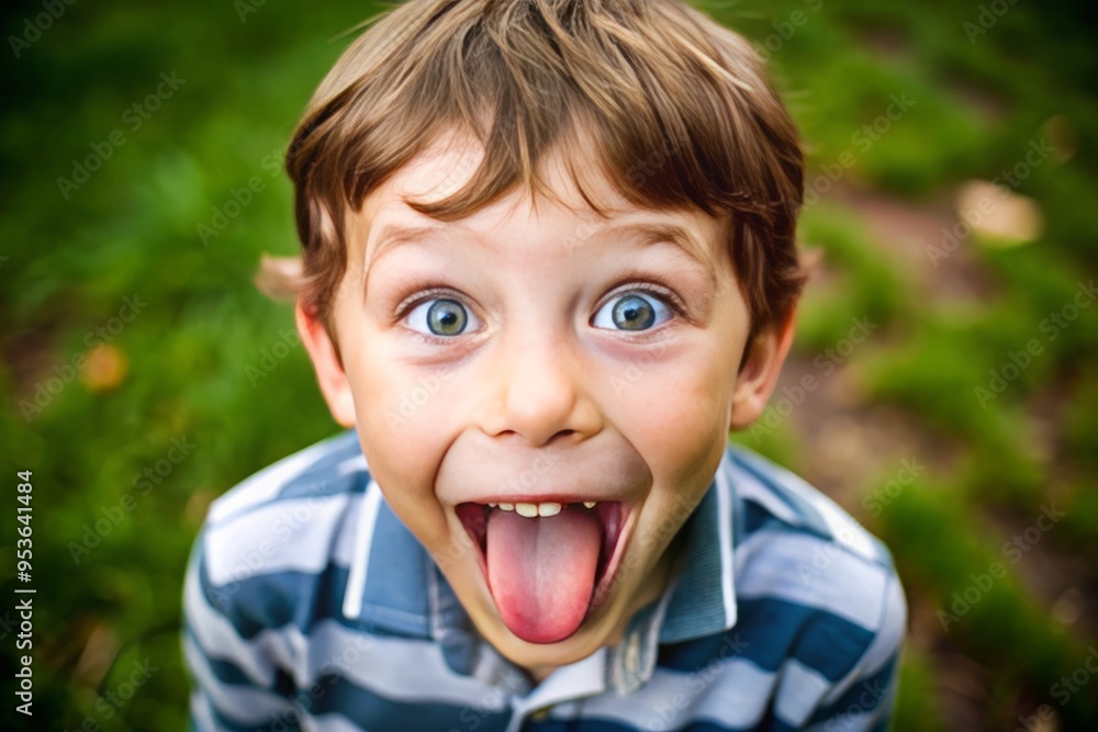 A joyful young boy with a goofy grin crossed eyes and a tongue out