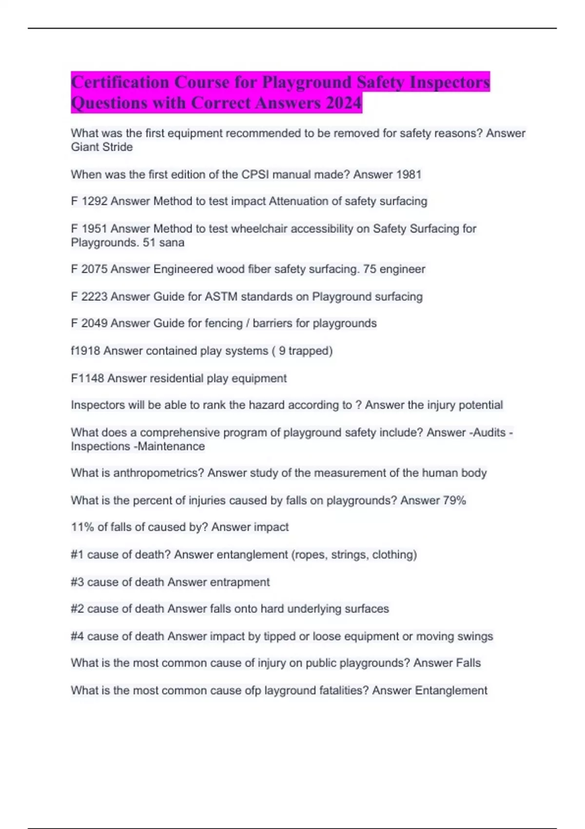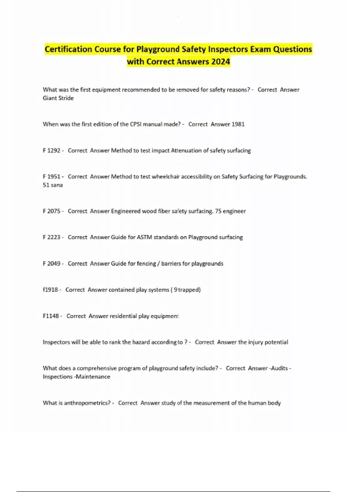 SOLUTION: Playground safety inspector certification questions answers