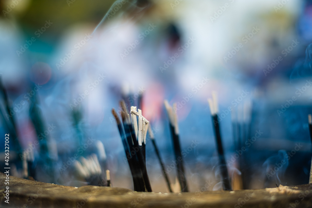 Incense sticks and the scented smoke close up in Jaya Sri Maha Bodhi