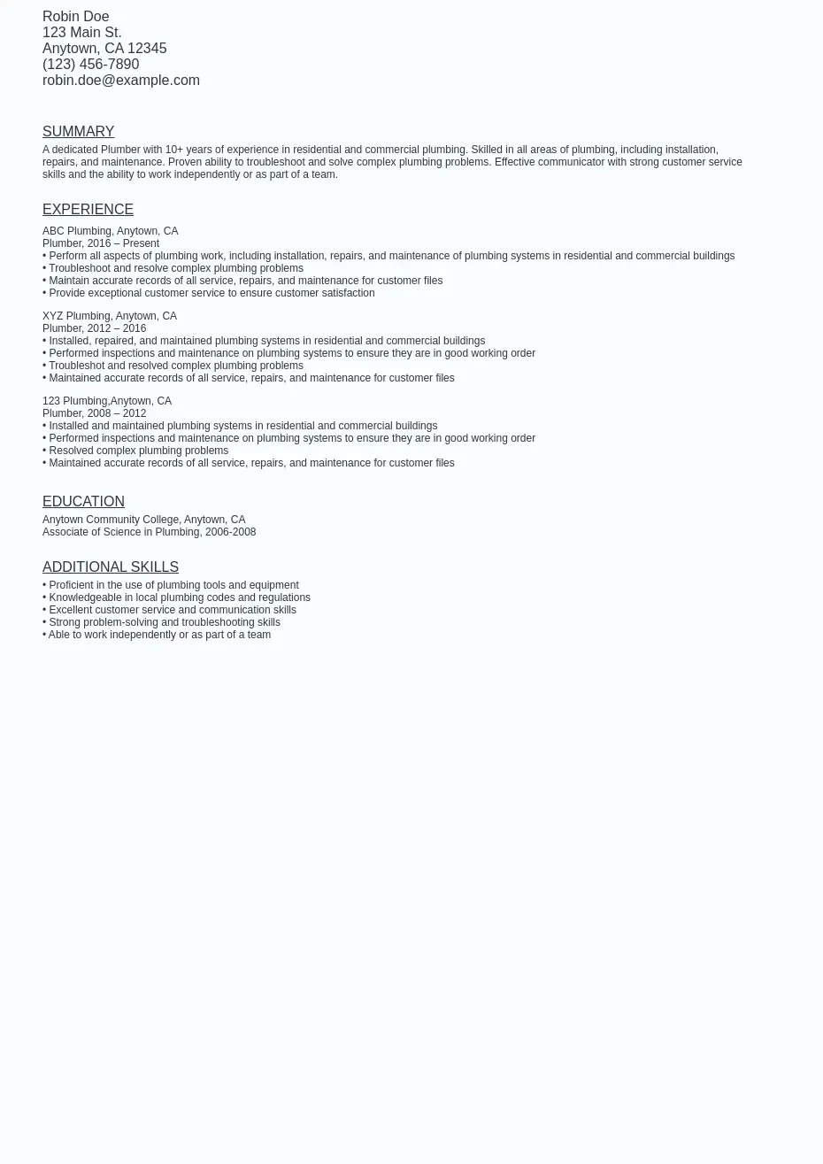 Plumber Resume Sample Template (Free Download) Ziprecruiter