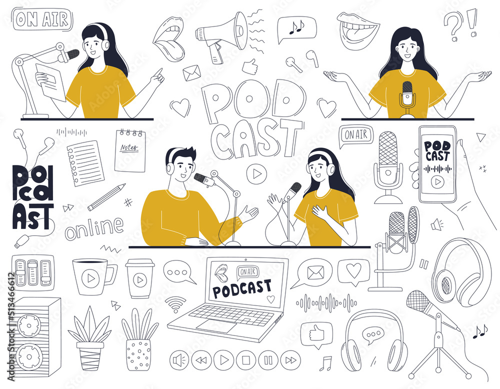 Set of doodle outline symbols of a podcast Woman and man hosting a