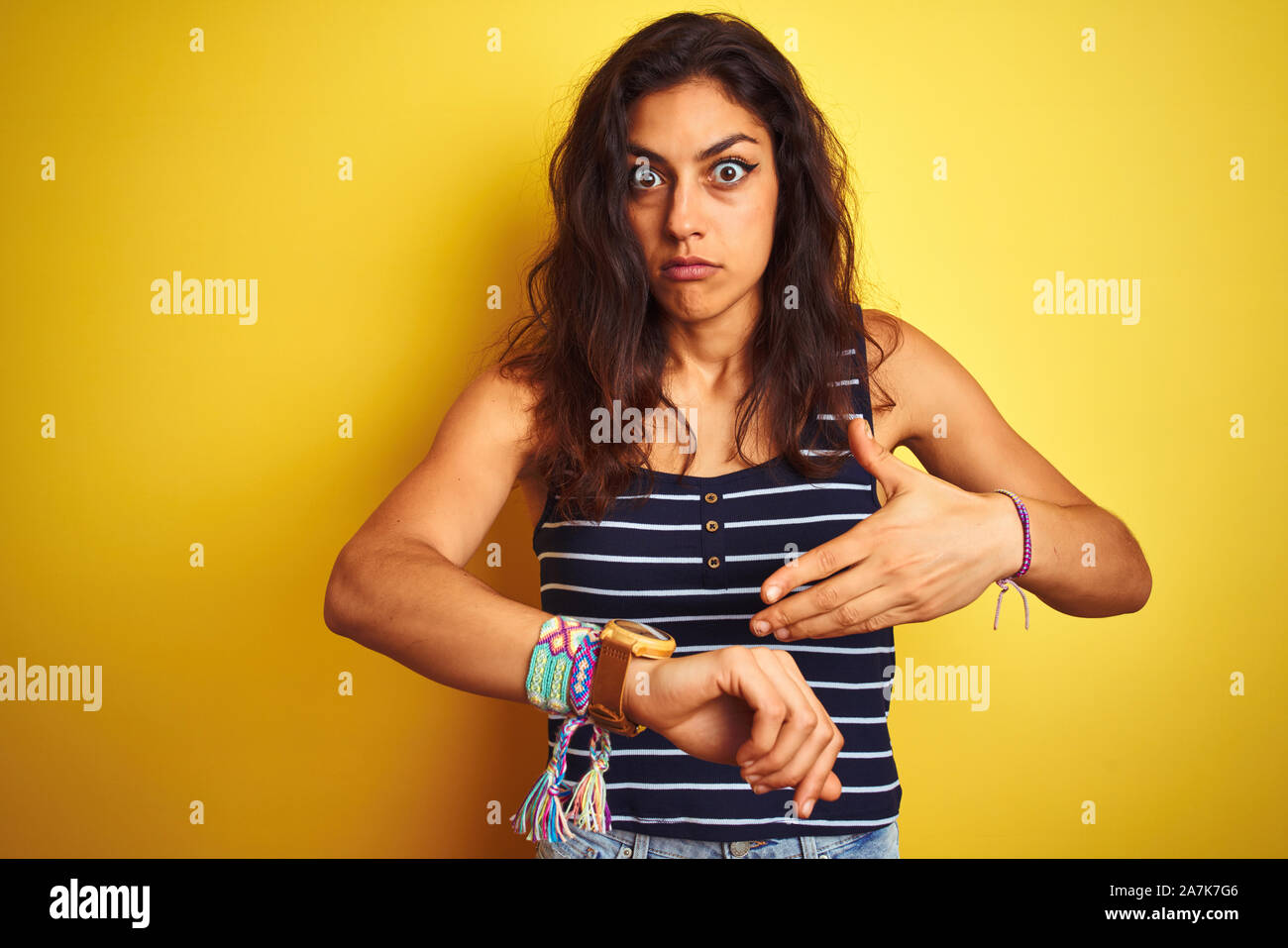 Young beautiful woman wearing striped t shirt standing over isolated