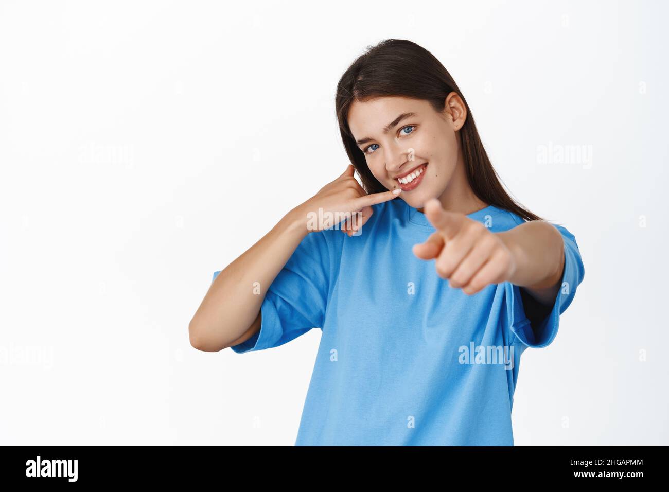 Call me Smiling modern girl pointing finger at camera and showing
