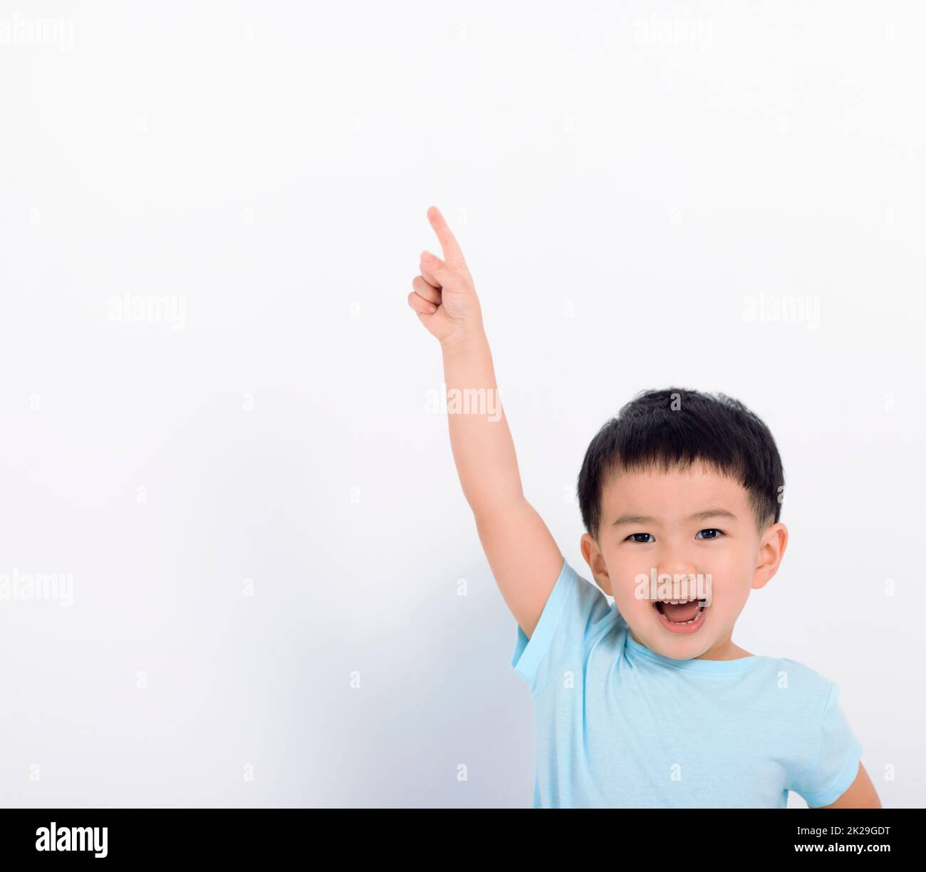 Happy little boy pointing to copy space Stock Photo Alamy