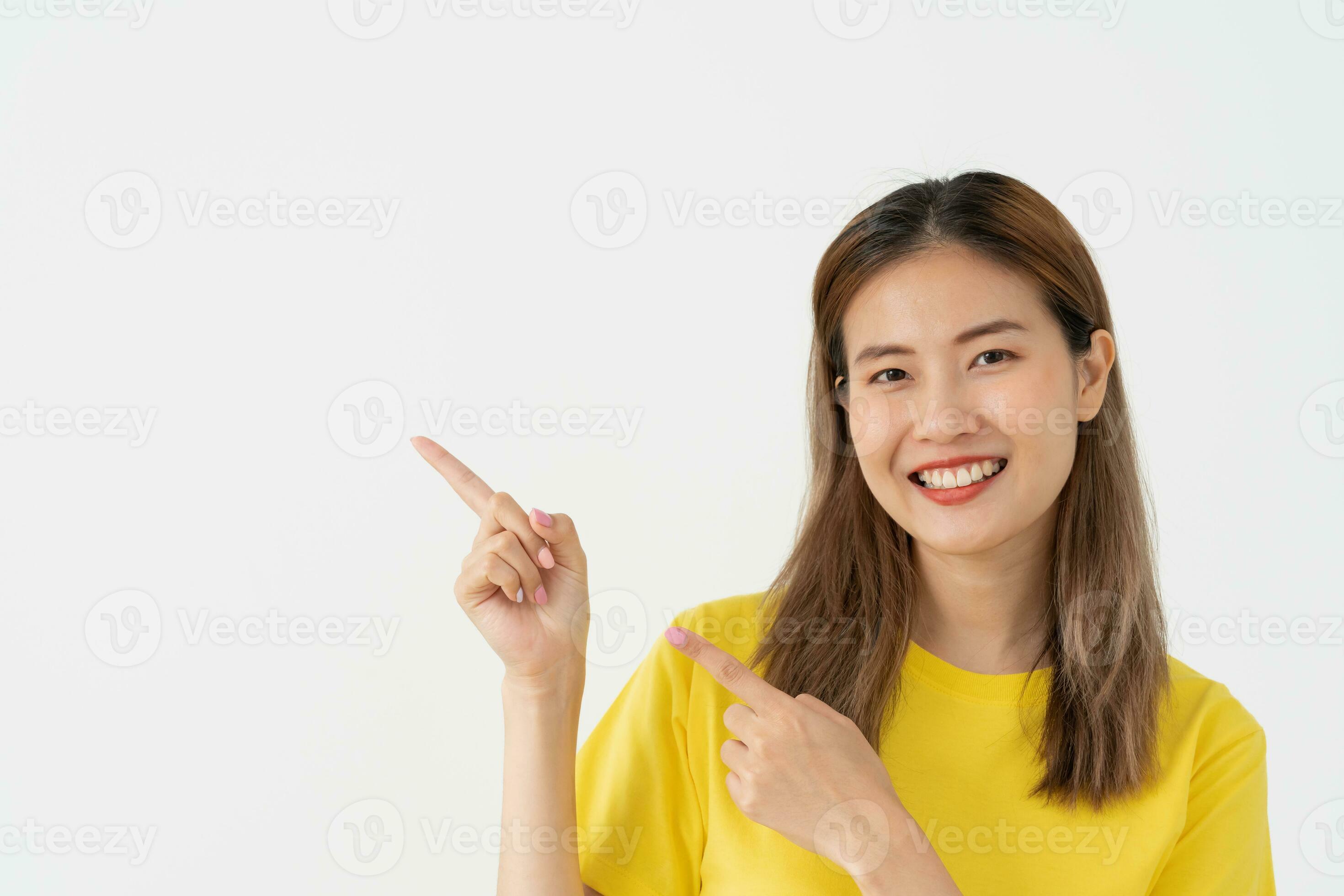 Portrait asian beautiful girl pointing blank space isolated background