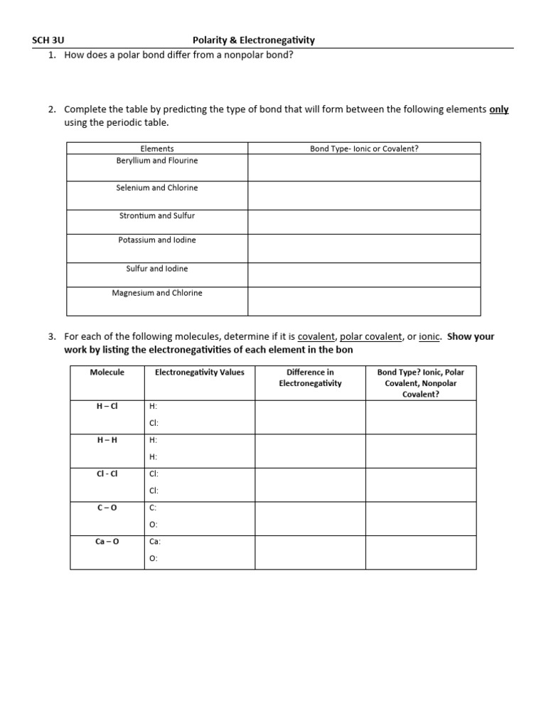 Bond Polarity and Electronegativity PDF Worksheets Library