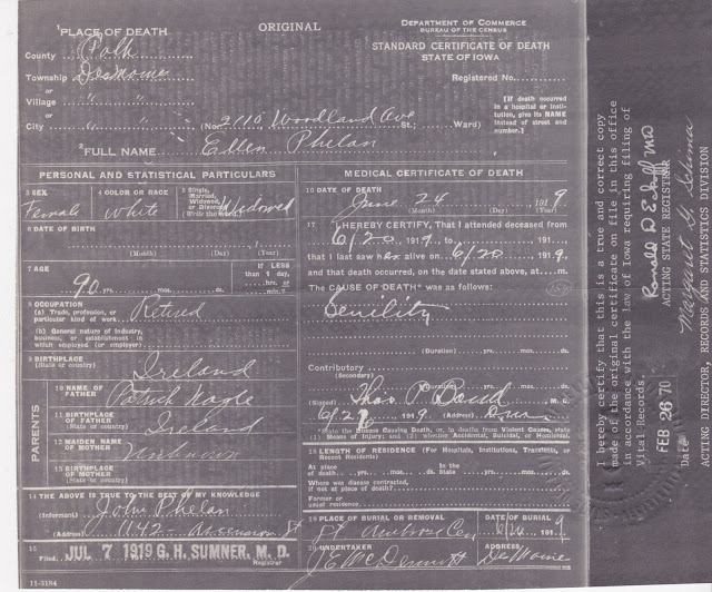 Wordless Wednesday: Death Certificate Ellen Nagel Phelan 1827 1919 Des