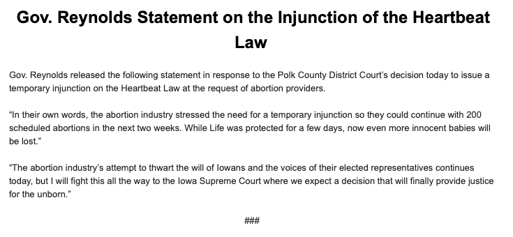District court judge temporarily blocks Iowa #39 s six week abortion ban