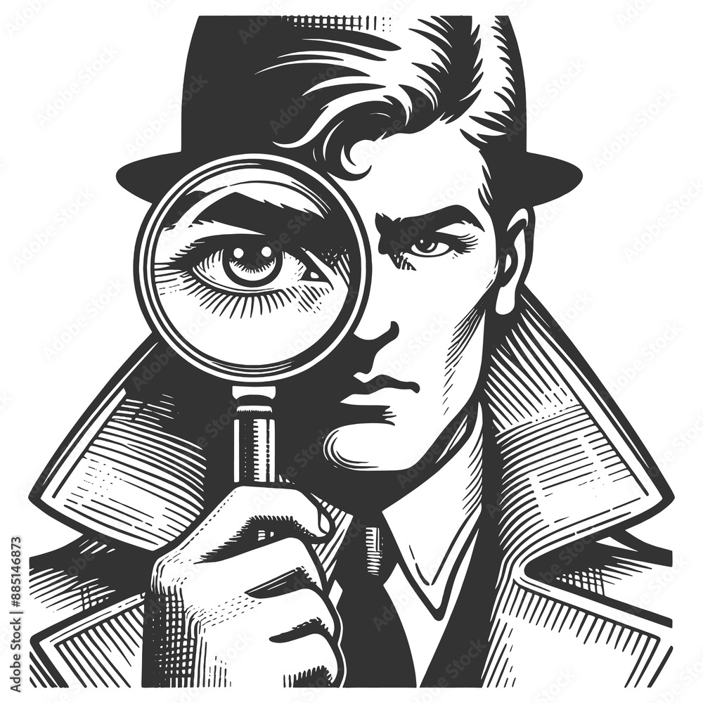 detective with a magnifying glass focusing intently on a clue sketch