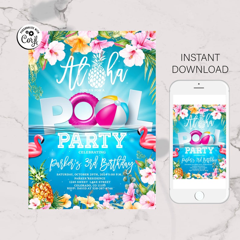 Editable Aloha Pool Party Invitation Aloha Birthday Invitation Pool