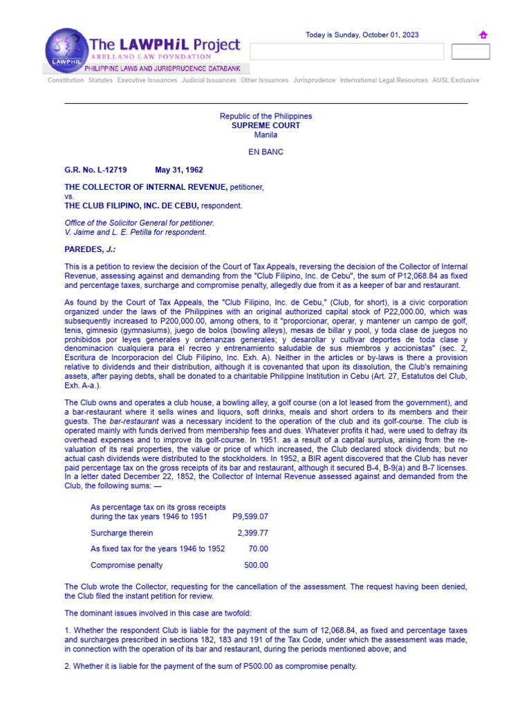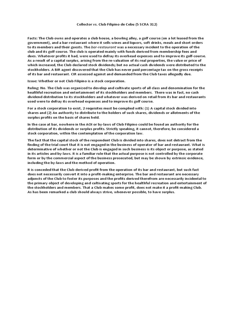 CIR Vs The Club FIlipino PDF Taxes Dividend