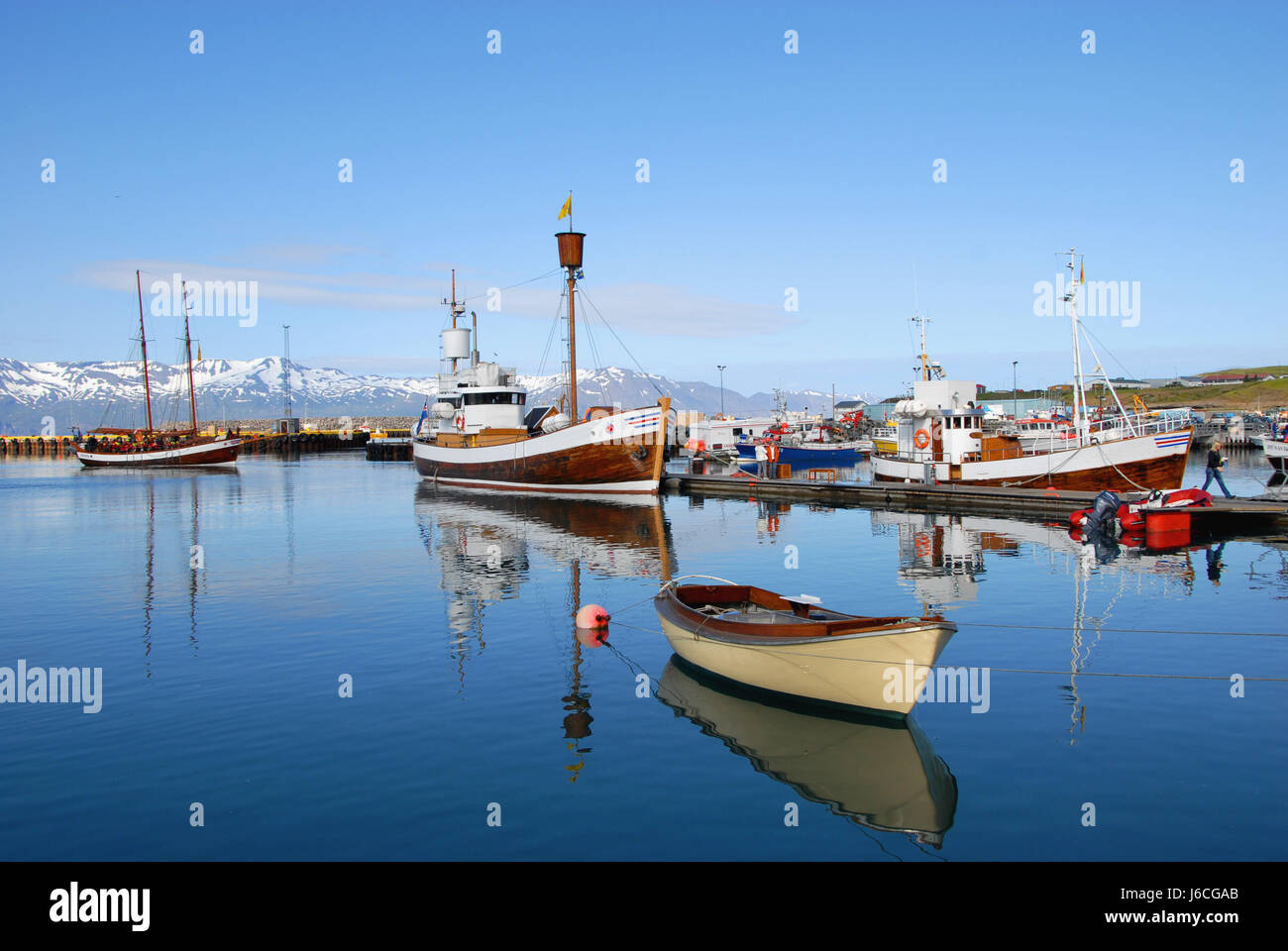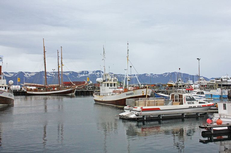 Whale Watching Safari Boats in Port of Husavik in North Iceland