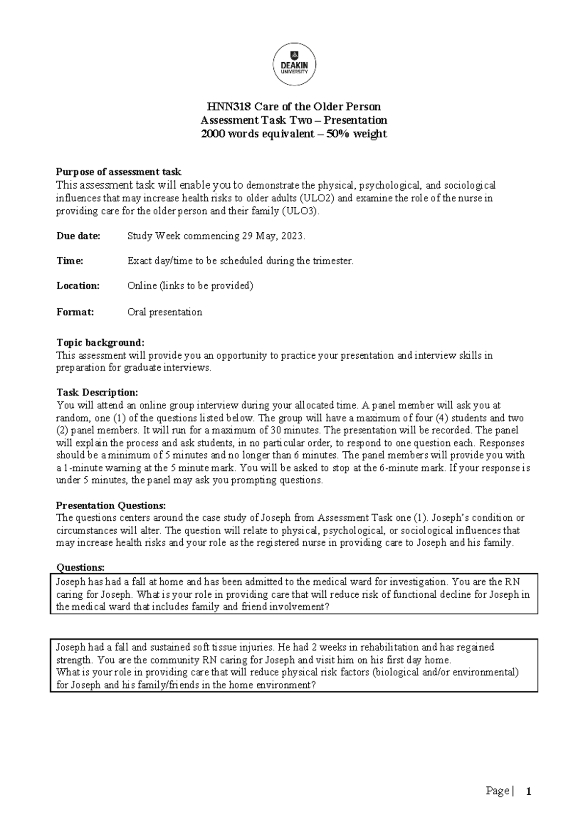 HNN318 AT2 2023 1 Assessment HNN318 Care of the Older Person