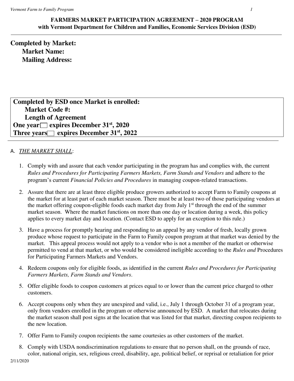 2020 Vermont Farmers Market Participation Agreement Fill Out Sign