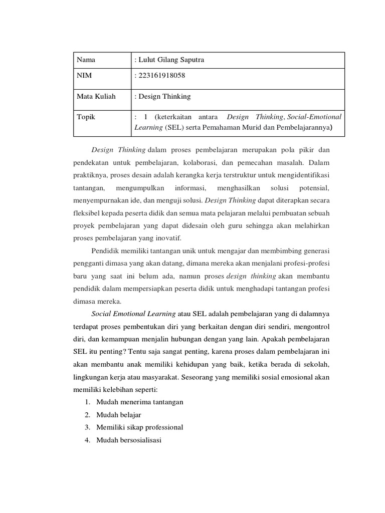 Keterkaitan Antara Design Thinking Social Emotional Learning (SEL