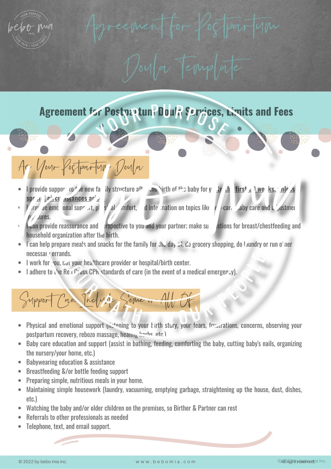 Postpartum Doula Contract Template Attorney written Editable Instant