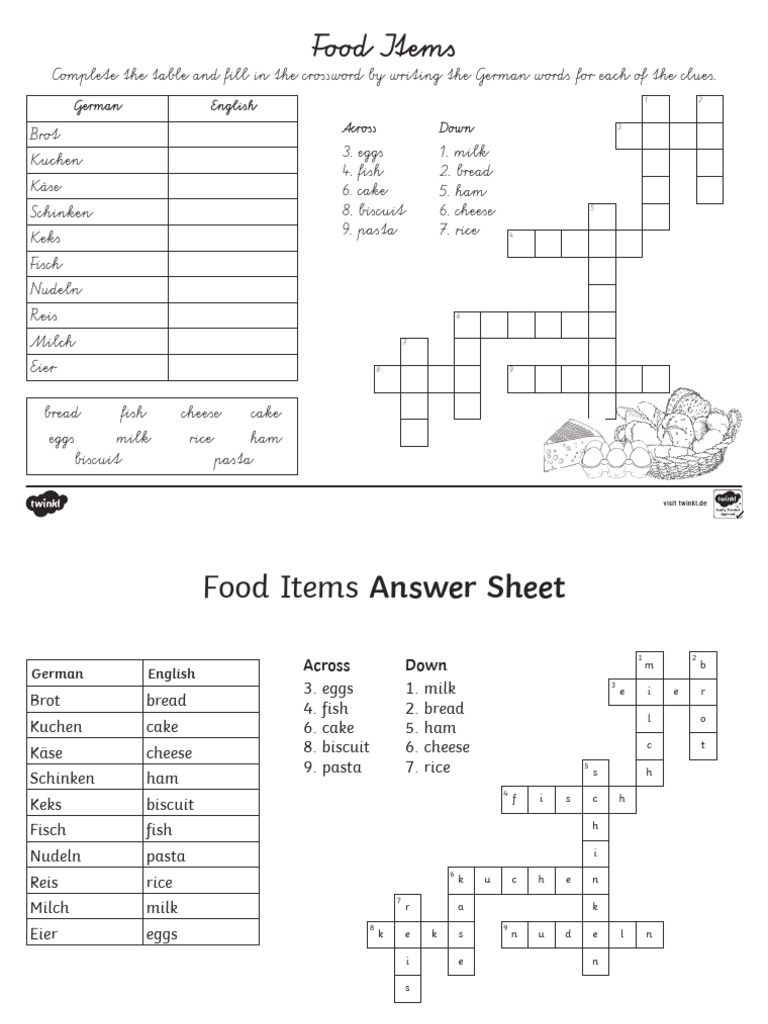 Food Items Crossword English German PDF Baking European Cuisine