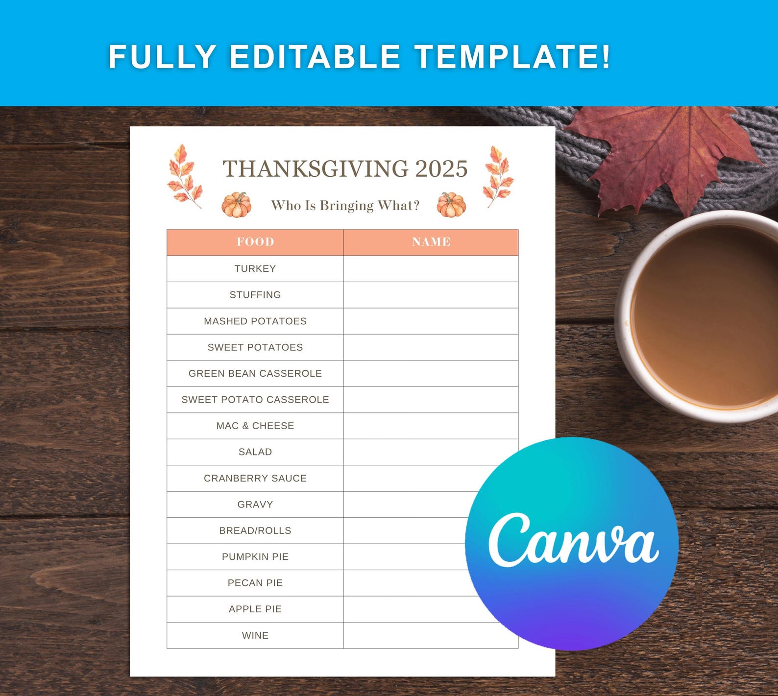Thanksgiving Potluck Sign up Sheet: Editable Canva Template (digital