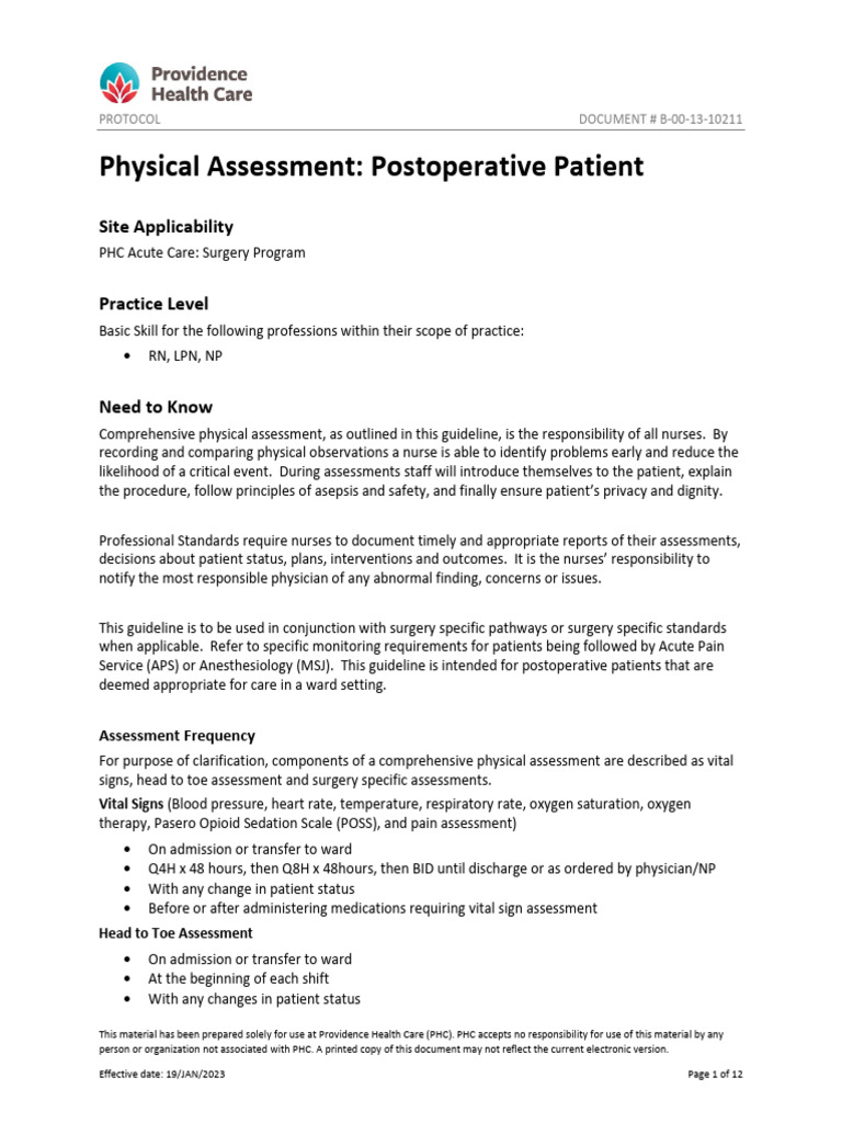 Providence Post Op Physical Assessment PDF