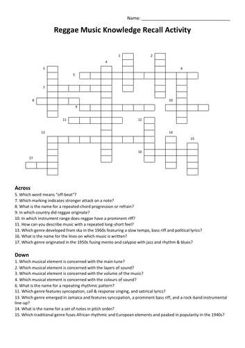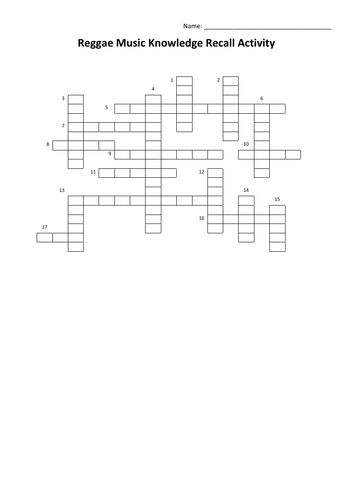 Reggae Music Knowledge Recall Activity Crossword Teaching Resources