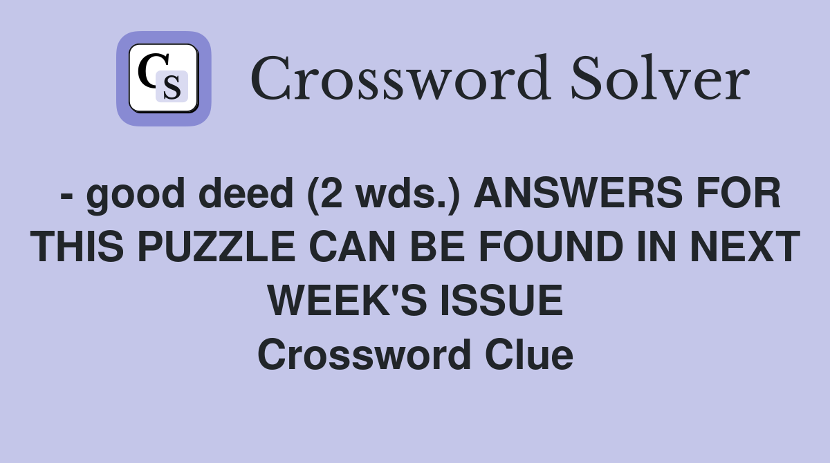 good deed (2 wds ) ANSWERS FOR THIS PUZZLE CAN BE FOUND IN NEXT WEEK
