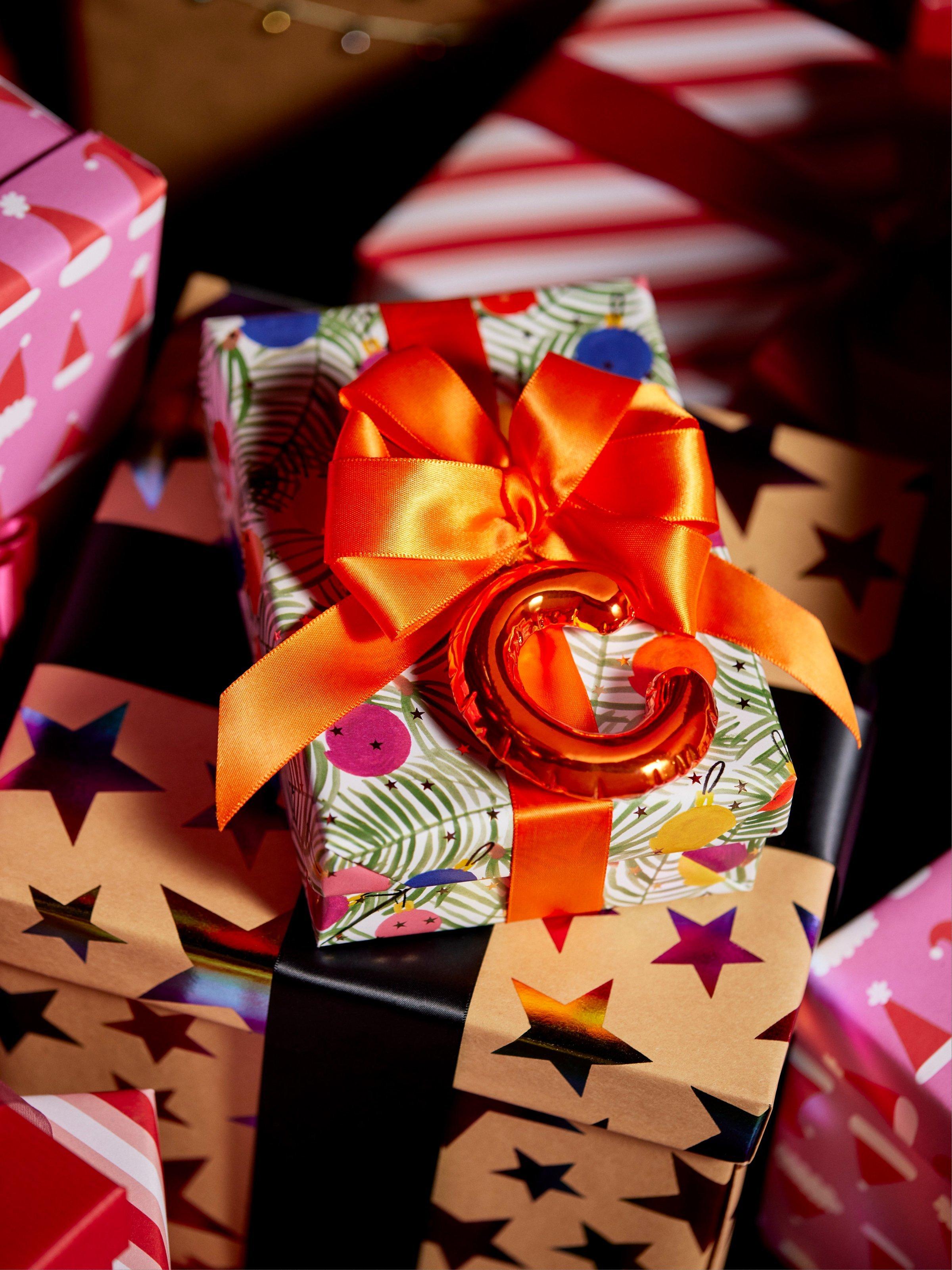 Premium Photo Gifts in craft paper with white tape in a supermarket
