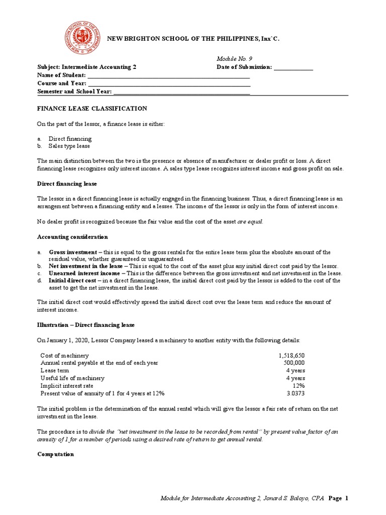 Module 9 DIRECT FINANCING LEASE LESSOR PDF Present Value Lease