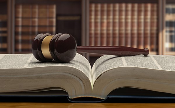 Law Concept Open Law Book with a Wooden Judges Gavel on Table in a