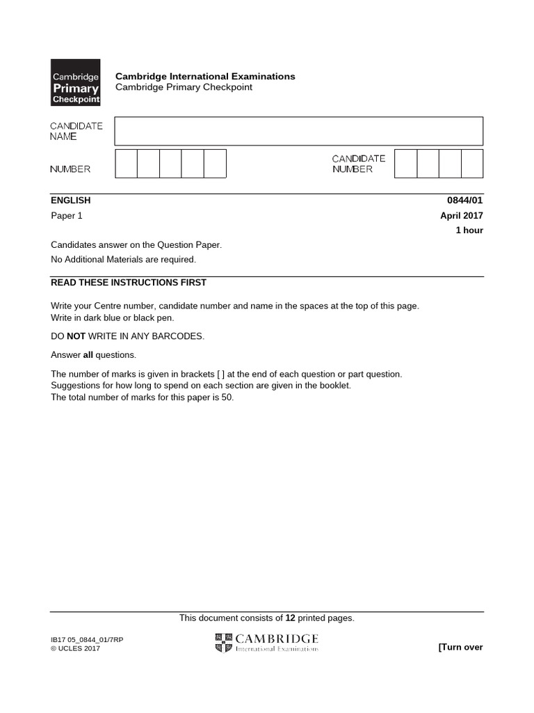 FINAL Primary Checkpoint English (0844) April 2017 Paper 1 Question