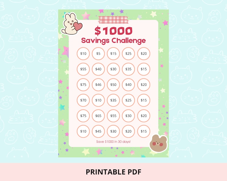 1000 dollar Savings Challenge Printable PDF / 1000 Savings Etsy