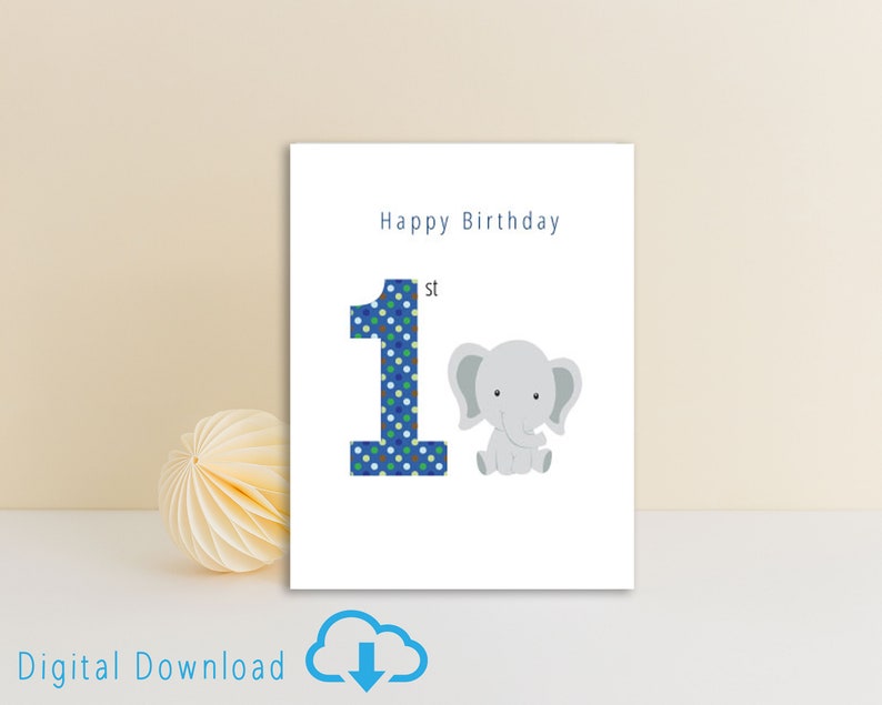Printable 1st Birthday Card Baby Elephant Digital Birthday Etsy