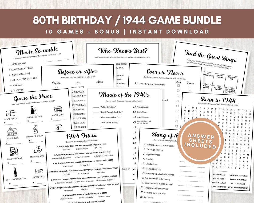 80th Birthday Party Games Printable Game Bundle With Answer Keys Born