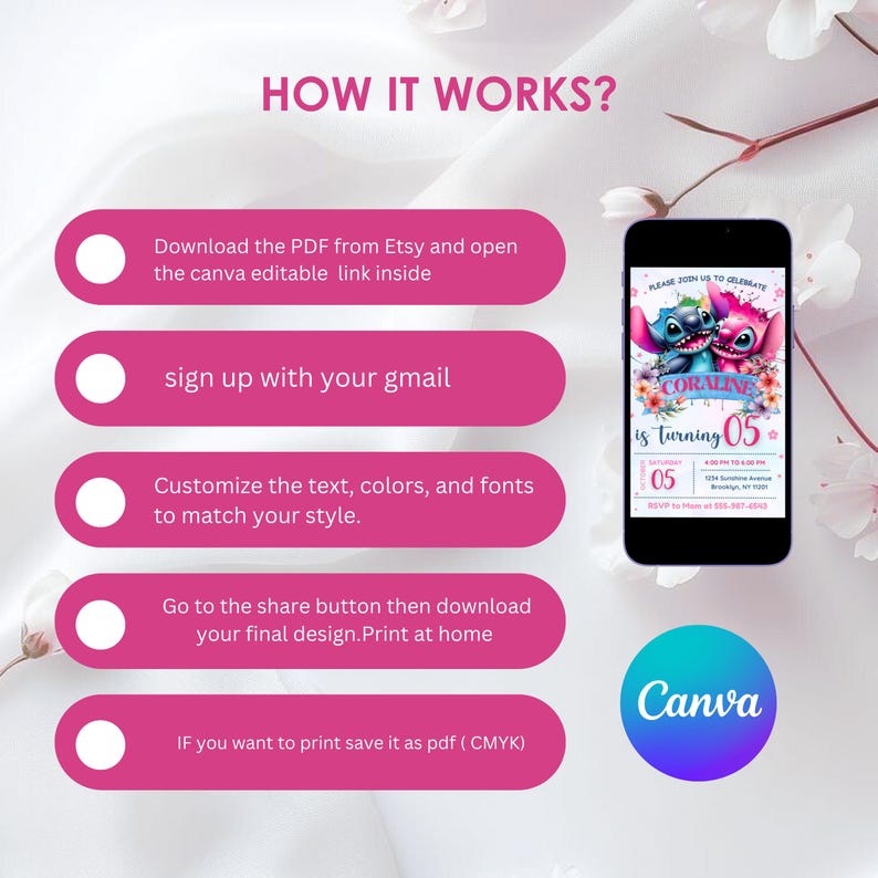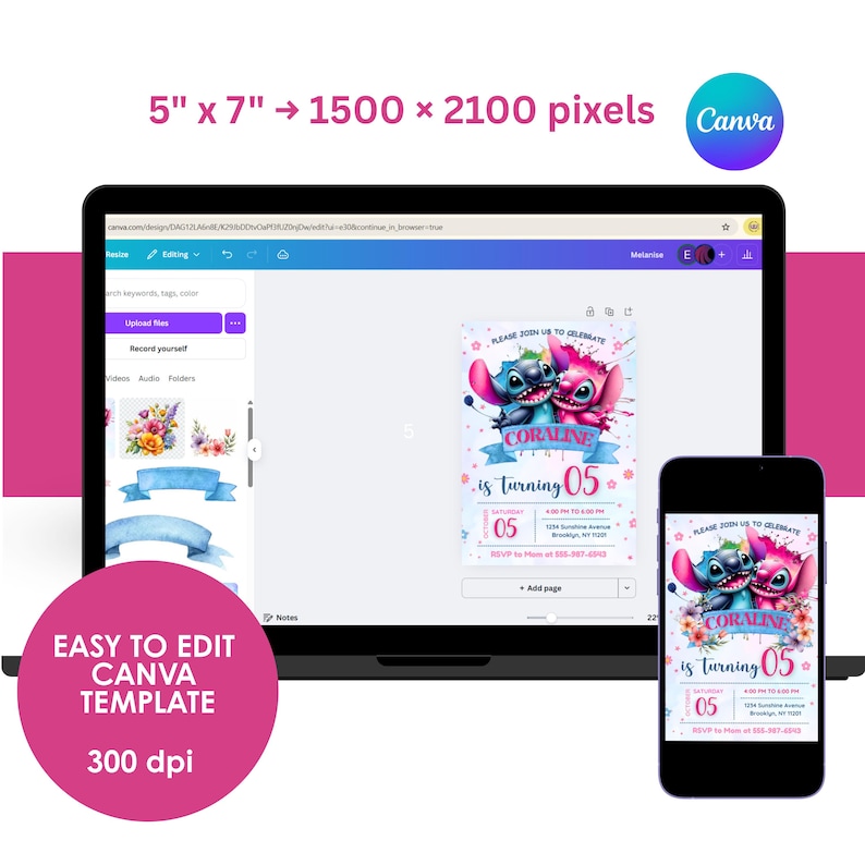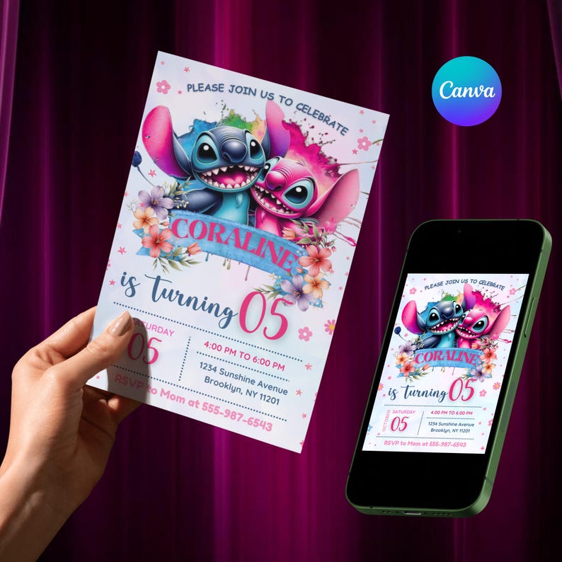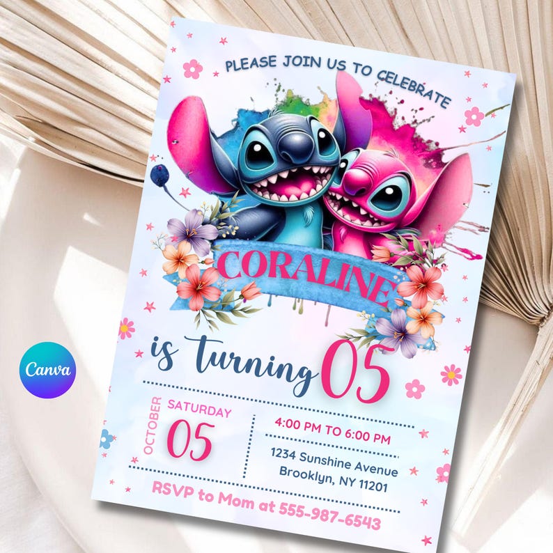 Editable Stitch Angel Birthday Invitation Kids Disney Party Invite