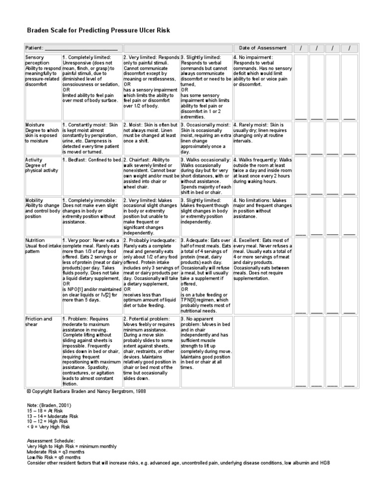 Pressure Ulcer Risk Assessment The Braden Scale For Predicting