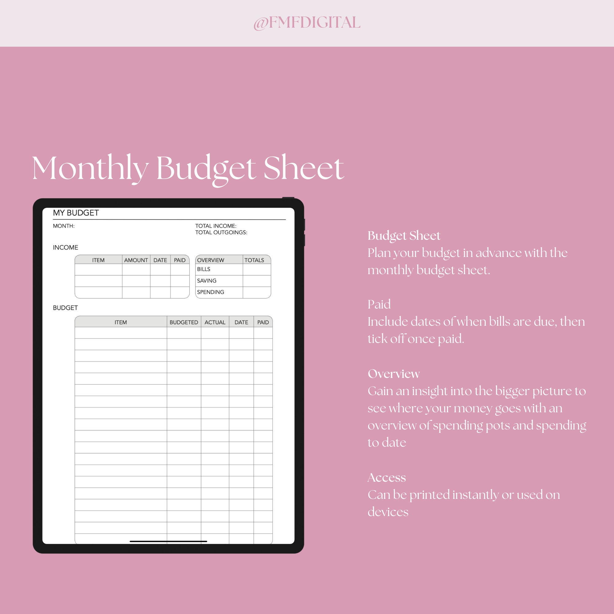 Monthly Budget Sheet Digital PDF Downloadable Printable Etsy