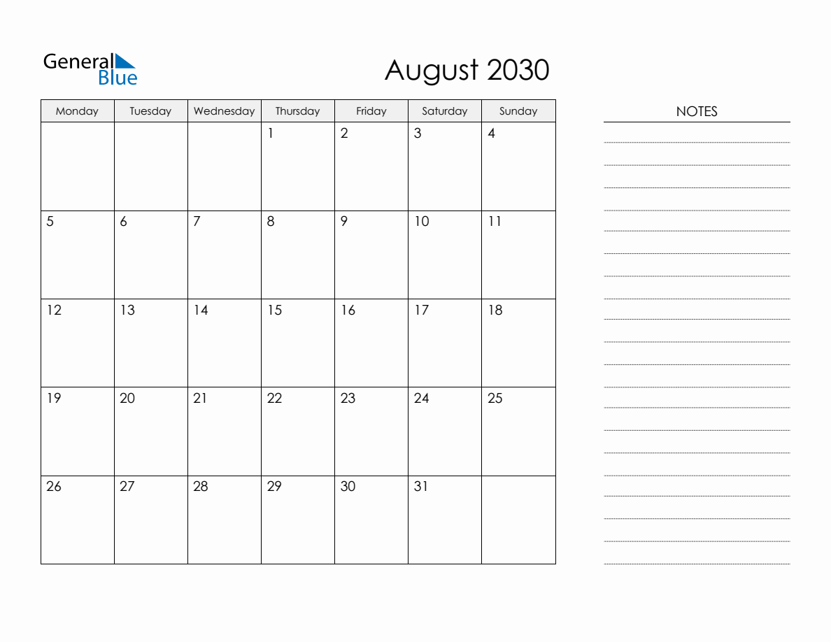Printable Monthly Calendar with Notes August 2030 Monday Start