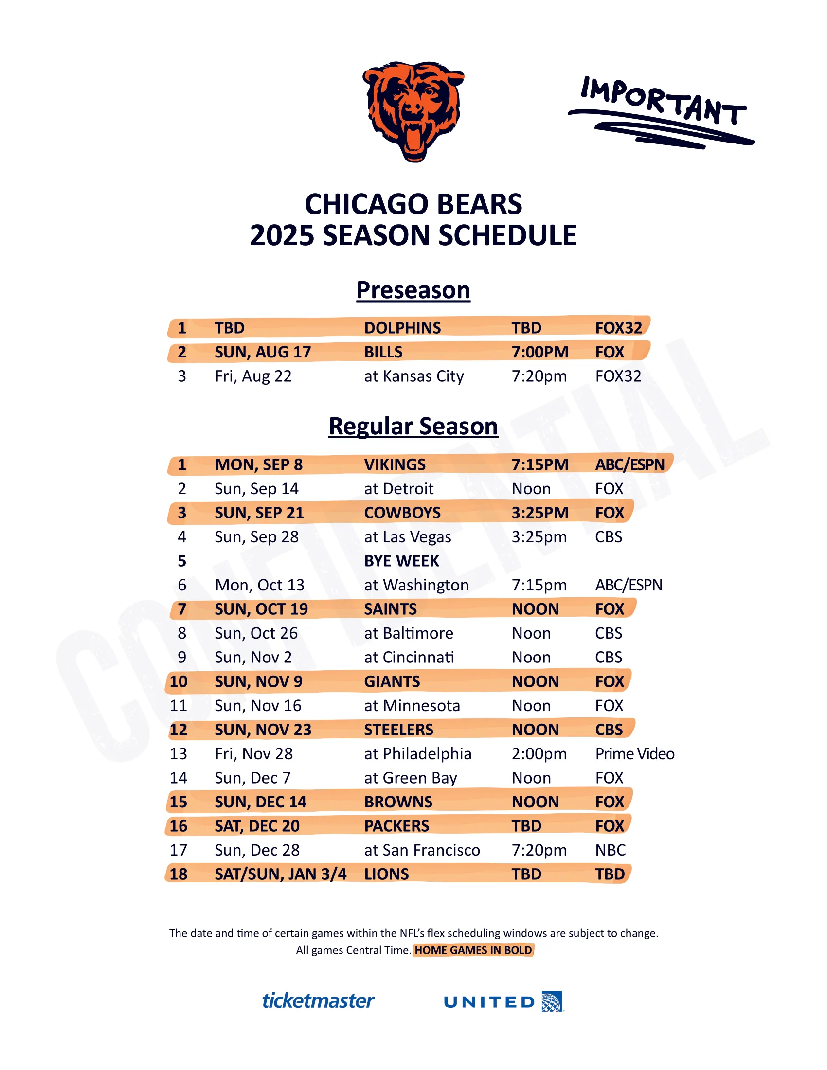 Printable 2025 Chicago Bears Schedule Matchups and TV Broadcasts
