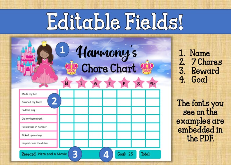 Princess Chore Chart: Editable Kids Reward Chart (printable) Etsy