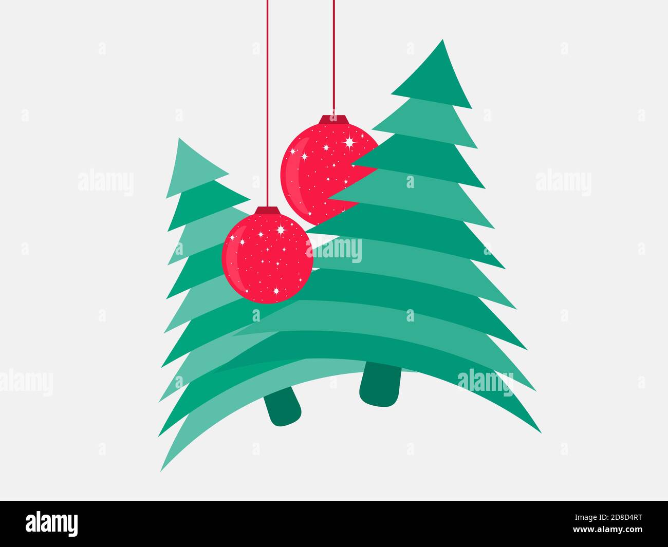 Two Christmas trees and hanging red Christmas balls on white bakcground