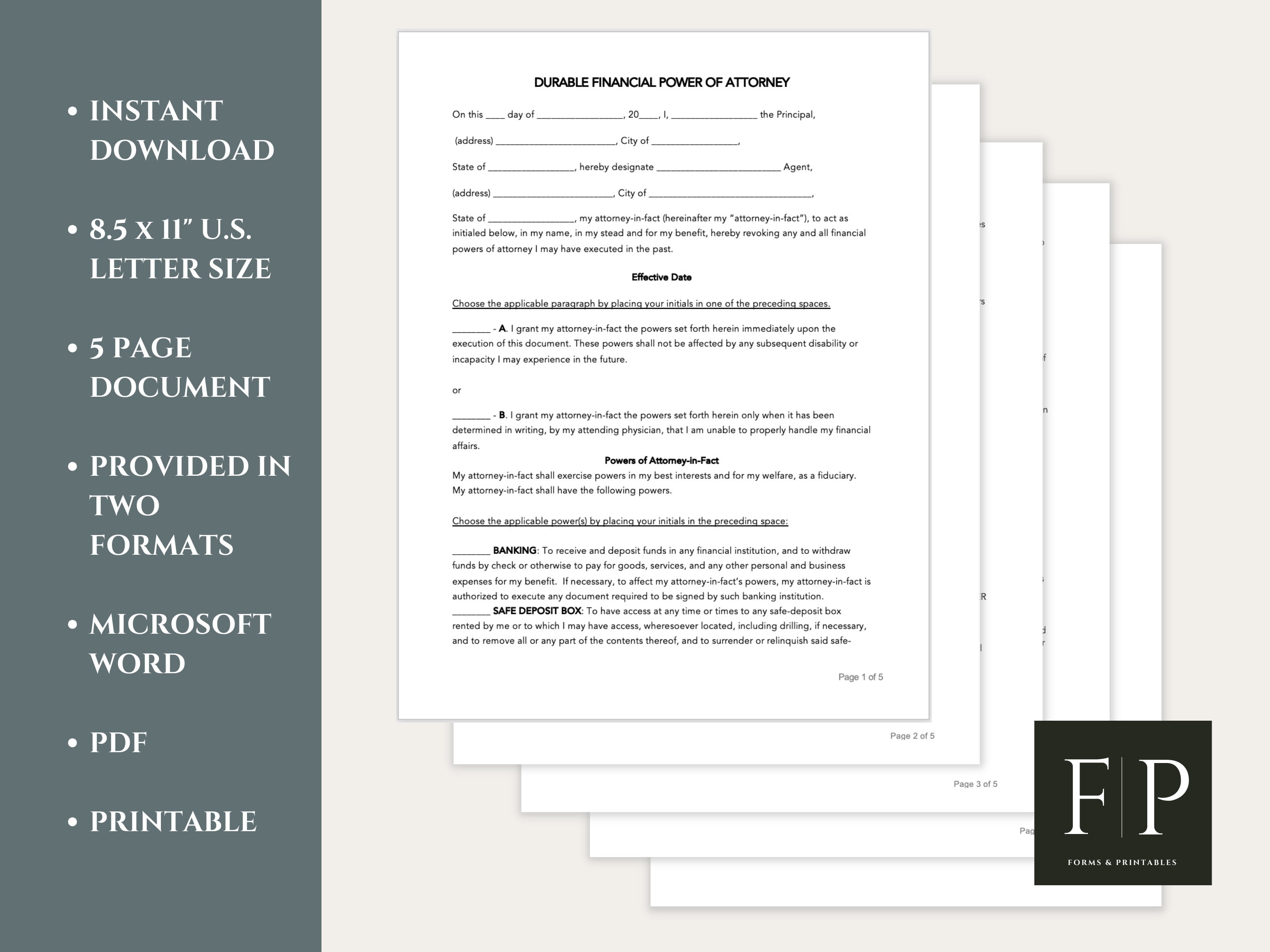Printable Durable Financial Power of Attorney Form Editable Etsy