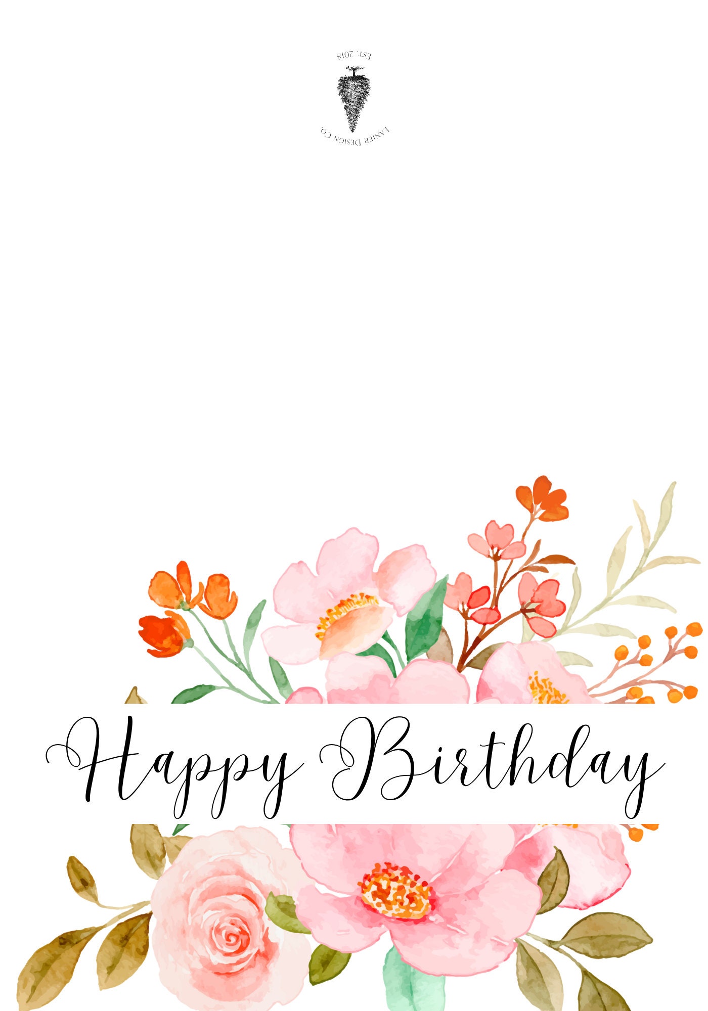 Printable Happy Birthday Card With Pink Watercolor Flowers Digital