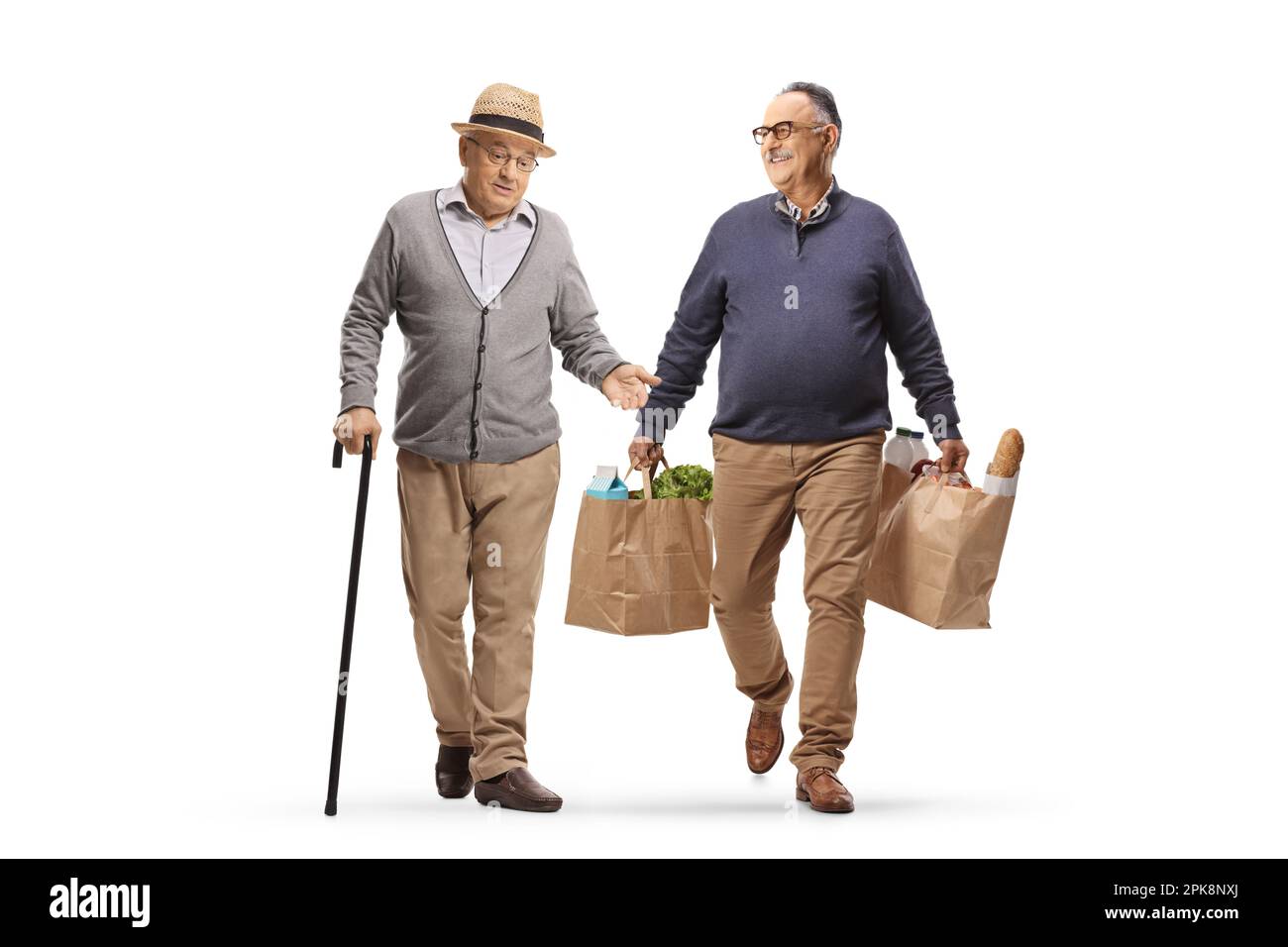 Mature man walking carrying grocery bags and having a conversation