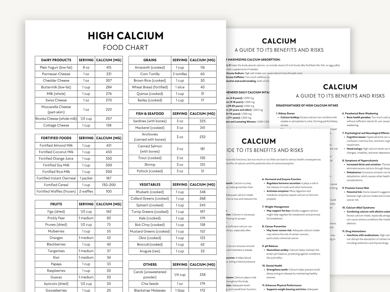 High Calcium Foods Reference Chart 1 Page Pdf PRINTABLE / INSTANT
