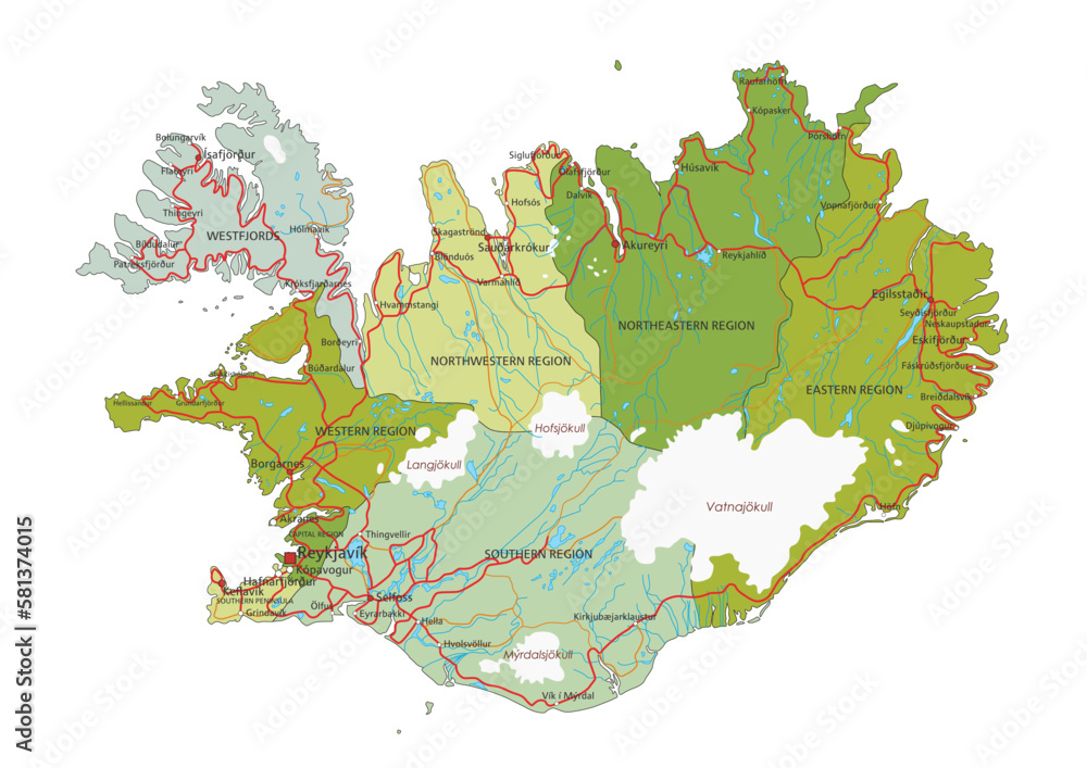 Vector Illustrated Blank Map of Iceland with Regions and Administrative