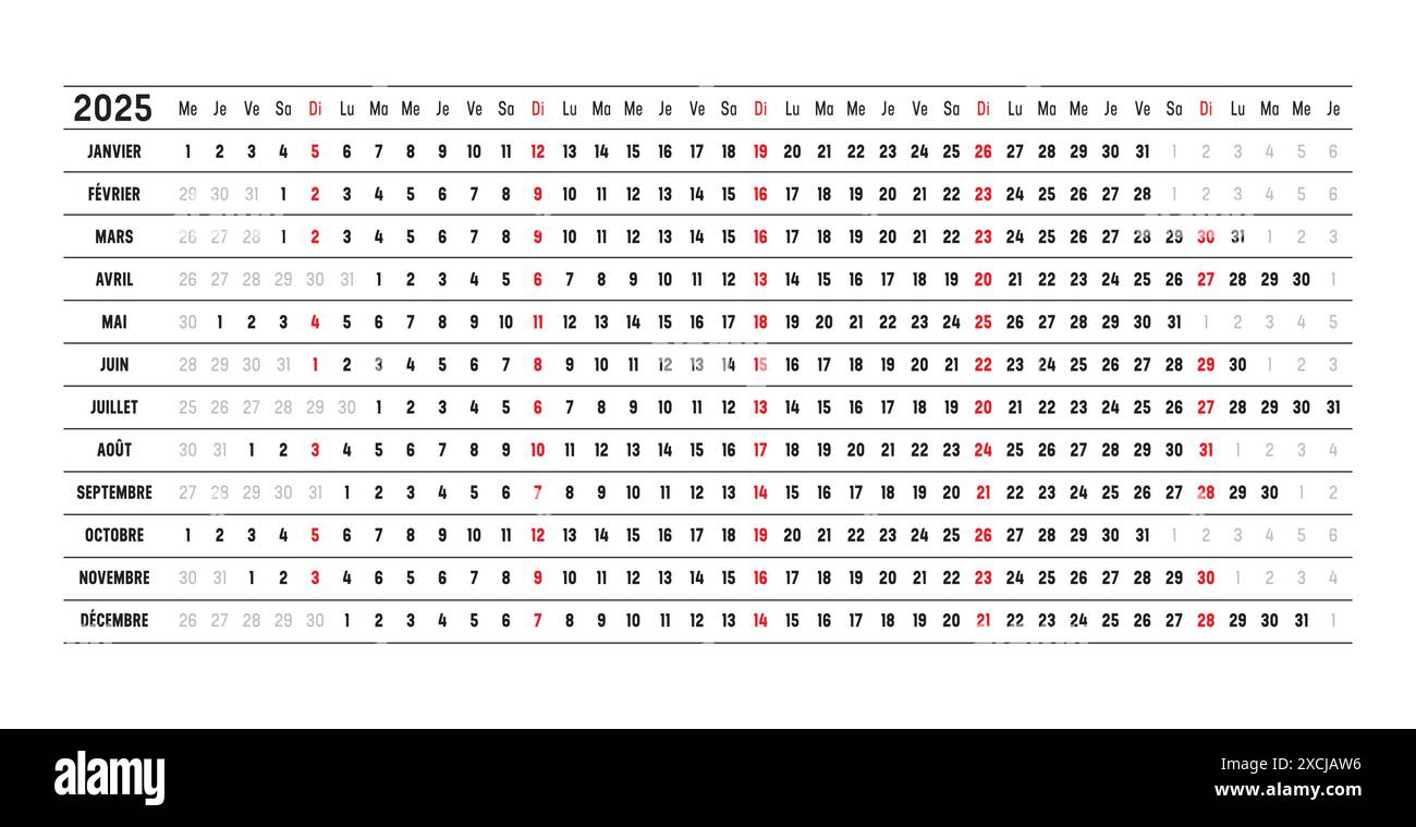 Linear calendar for 2025 horizontal or landscape orientation grid 2025