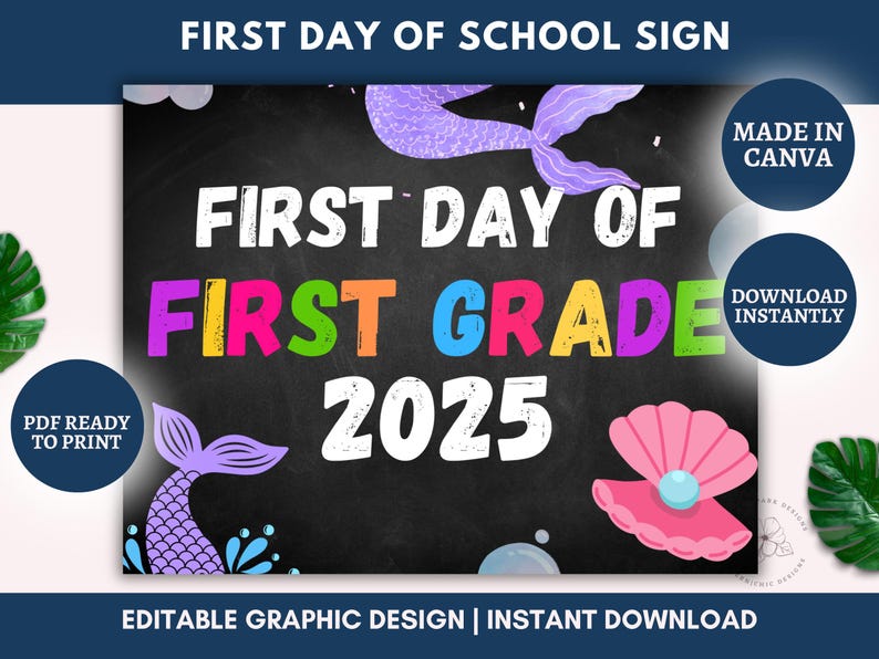 Mermaid First Grade Sign 2025 Chalkboard Photo Prop (canva Template
