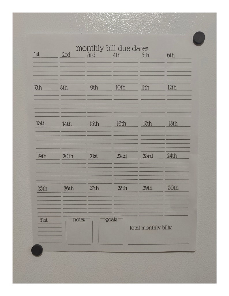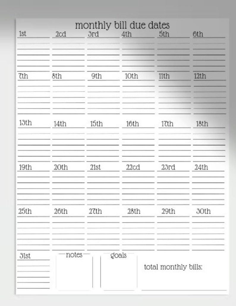 Printable Monthly Bill Chart